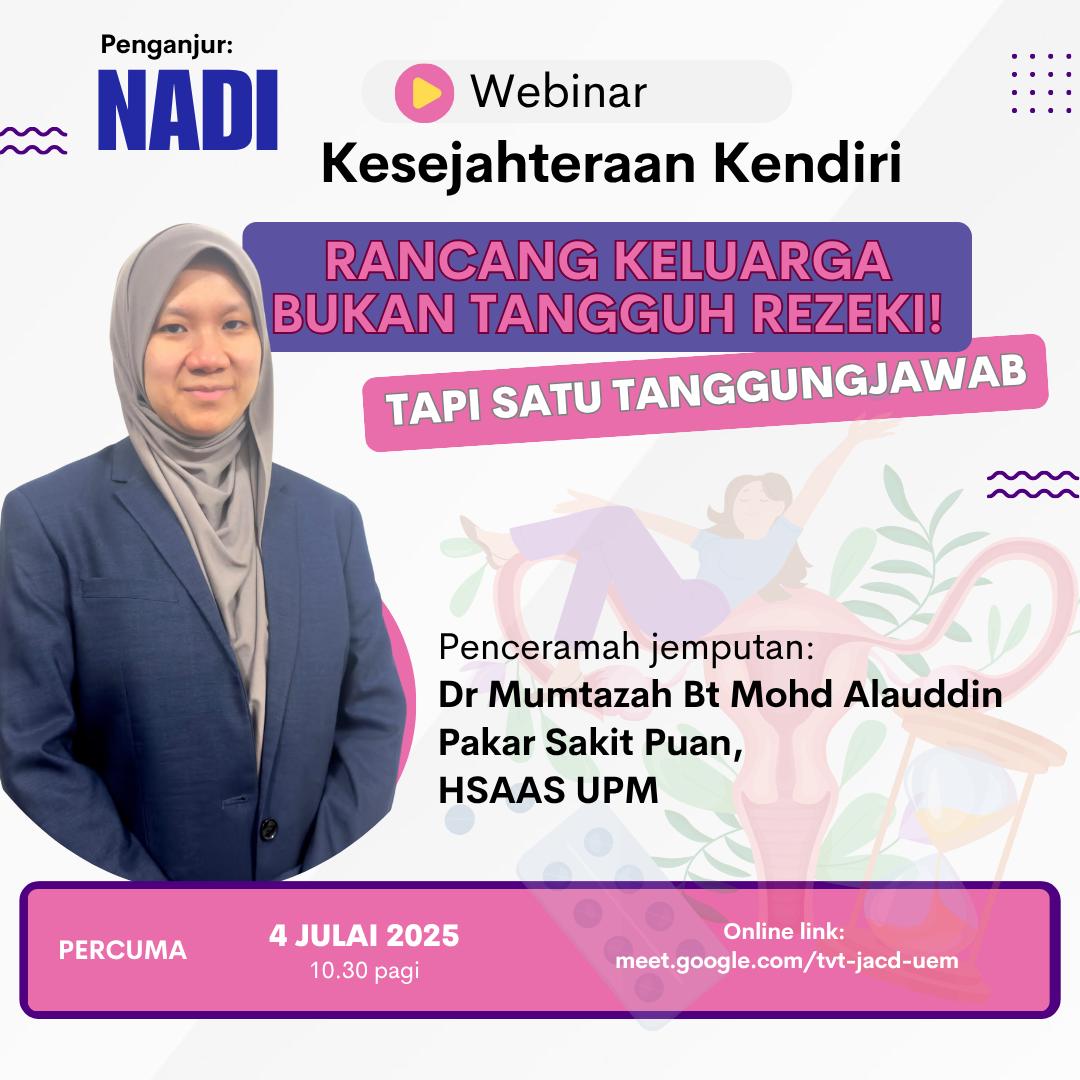 🎙️ Penceramah: Dr Mumtazah binti Mohd Alauddin 👩⚕️ Pakar Sakit Puan, HSAAS UPM 💡 Ramai wanita takut atau ragu nak guna kaedah perancang keluarga, kononnya takut gemuk, mandul, dan "menghalang rezeki". Tapi sejauh mana kebenarannya? 📌 Sertai webinar ini […]
